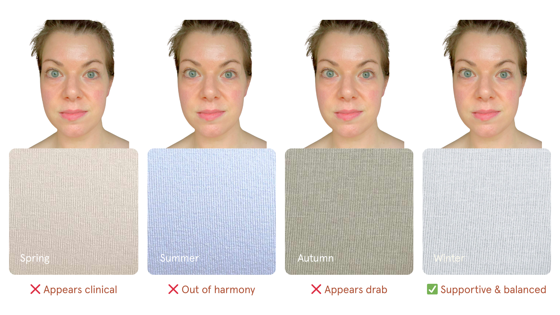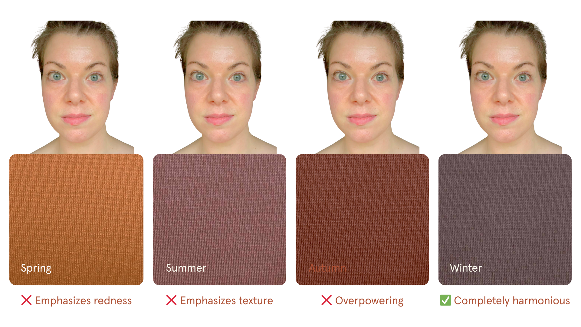 Scroll on to see EXACTLY what we saw in her analysis. Remember, never draw conclusions based on a single color. Proper color analysis identifies complexion patterns and season correlations through repeated, systematic comparisons: