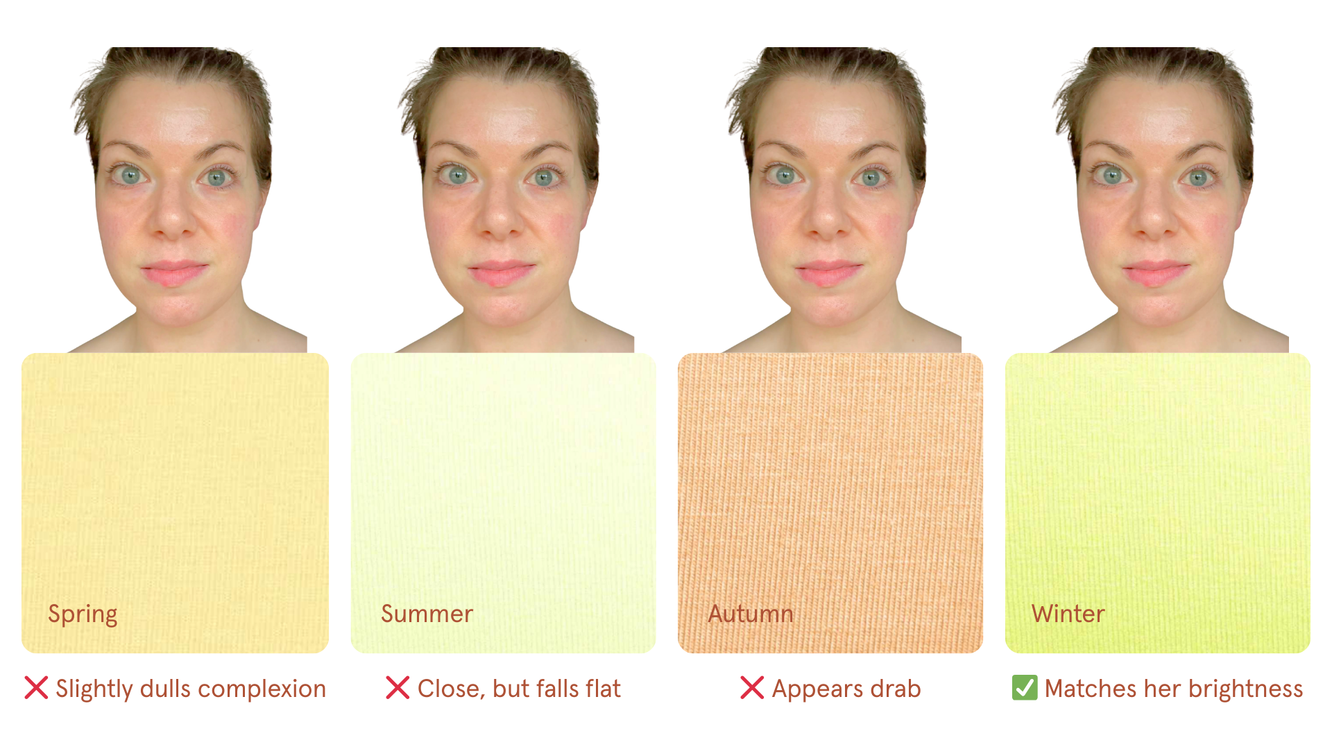 In my experience as an analyst, when I see a client with Lydia’s coloring, who looks equally good in Spring and Summer colors, I’ve learned to always check Winter. The brightness of Spring will suit her, and the coolness of Summer will suit her - often meaning her best colors might be bright AND cool (Winter). If Winter is obviously not the answer (which would be the case if she were a light season), I can then go back and compare more closely between Light Spring and Light Summer to determine her season.