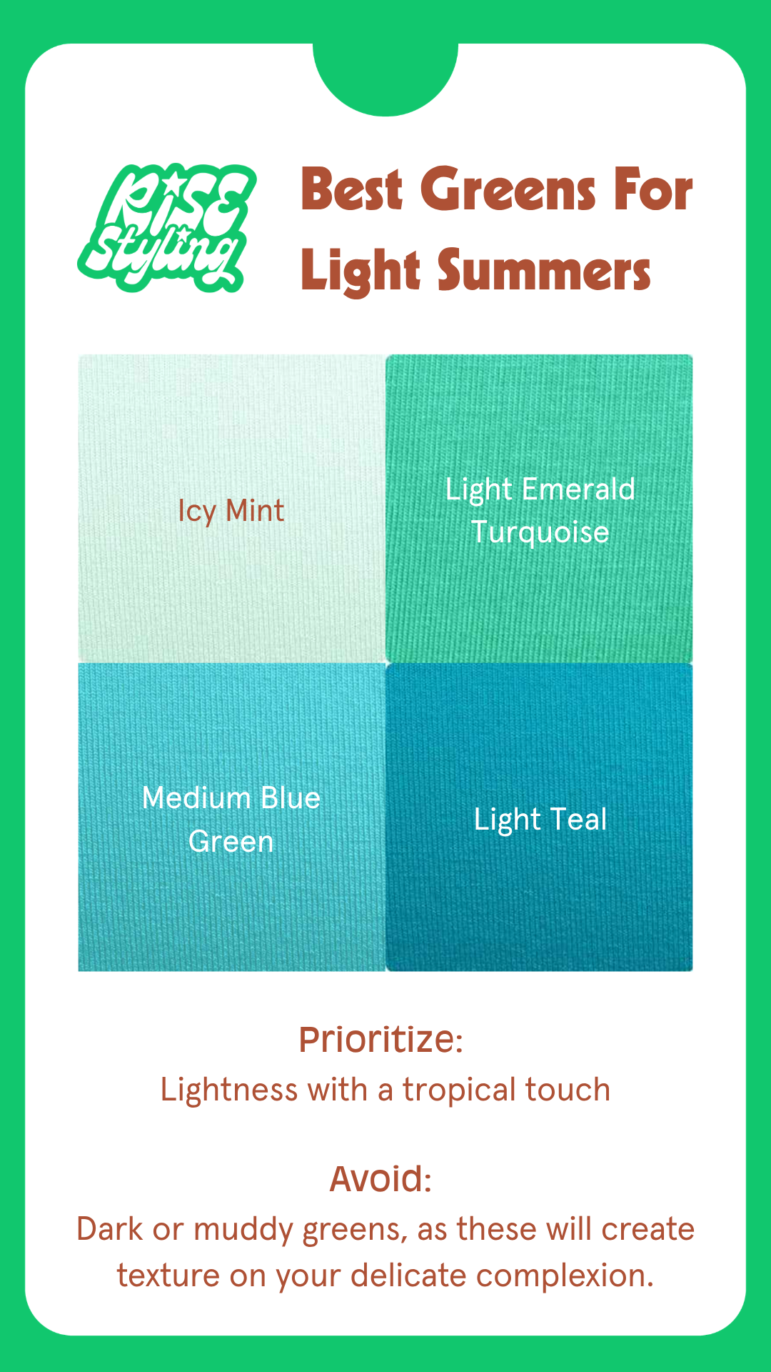 Cool Summer: Your perfect greens are also shades of teal, from Icy Mint all the way to Deep Teal. These colors will harmonize with your cool undertones. Think of the colors of a stormy sea: complex and blending into one another from light to dark.