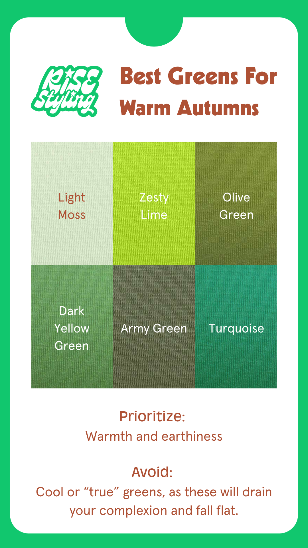 Fun fact: there are more visible hues of green than any other color in the light spectrum! No matter what color you add to green, it’s still GREEN (even if you add a bit of red to green, it turns a bit brownish, and is still green!). Because Autumn is a soft season, they can take a wide variety of blended warm greens like the ones we see in nature, as well as the off-greens from teal all the way to bronze.